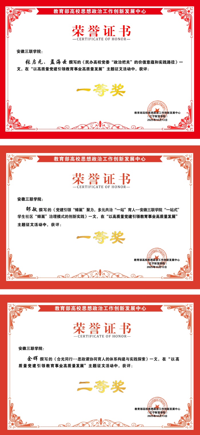 近日,教育部高校思想政治工作创新发展中心(辽宁财贸学院)发布“以高质量党建引领教育事业高质量发展”主题征文活动评选结果,学校选送的论文《民办高校党委“政治把关”的价值意蕴和实践路径》获评一等奖,案例《党建引领“蜂巢”聚力,多元共治“一站”育人——安徽三联学院“一站式”学生社区“蜂巢”治理模式的创新实践》《合光同行——思政课协同育人的体系构建与实践探索》获评一、二等奖,充分彰显了学校在推动党建工作与事业发展深度融合等方面的系统思考和扎实成效。