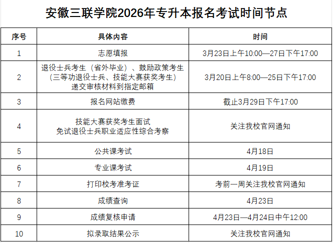 本次公布的为我校2026年普通高校专升本拟招生方案,最终确定的招生专业、范围、考试科目等内容,以我校经安徽省教育厅审核后发布的《安徽三联学院2026年普通高校专升本招生章程》为准。