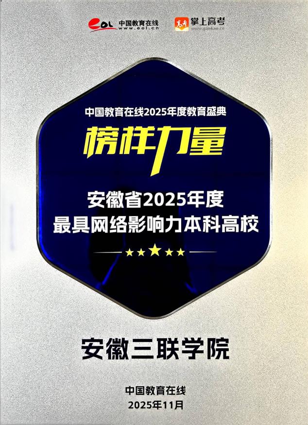 近日,中国教育在线“榜样力量·2025年度教育盛典”优秀案例名单公布。安徽三联学院获评“安徽省2025年度最具网络影响力本科高校”。