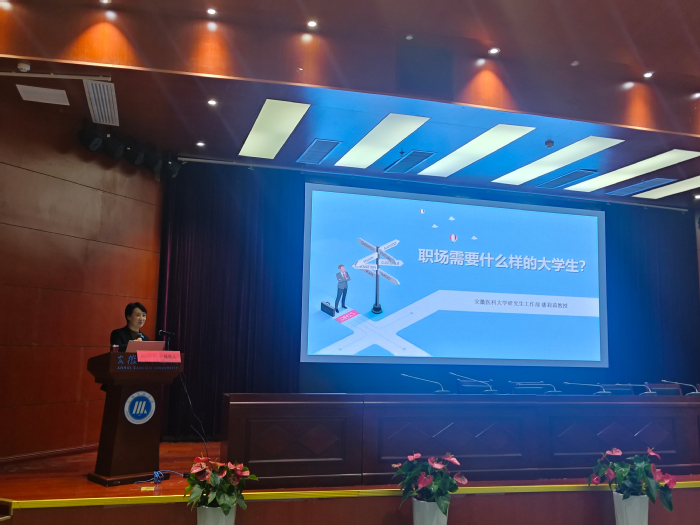 11月10日,学校在学术报告厅举办《职场需要什么样的大学生》报告会。报告会特邀安徽医科大学党委研究生工作部部长、全国首席职业指导师潘莉莉教授担任主讲。省教育督导专员、党委书记王光虎,副校长蔡文芬参加报告会。报告会由副校长洪梅主持。