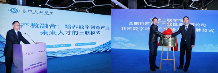当日下午,由安徽三联学院参与主办的2025紫云山数字创意产学研交流会(论坛)在紫云山文化创意产业园成功召开。潘涛作《产教融合:培养数字创意产业未来人才的三联模式》主题报告,系统介绍了学校在校企协同、项目驱动、工作室制等方面的探索与成效。会上,安徽三联学院与合肥包河文广产业投资有限公司为校企共建的“数字动漫产学研基地”揭牌。